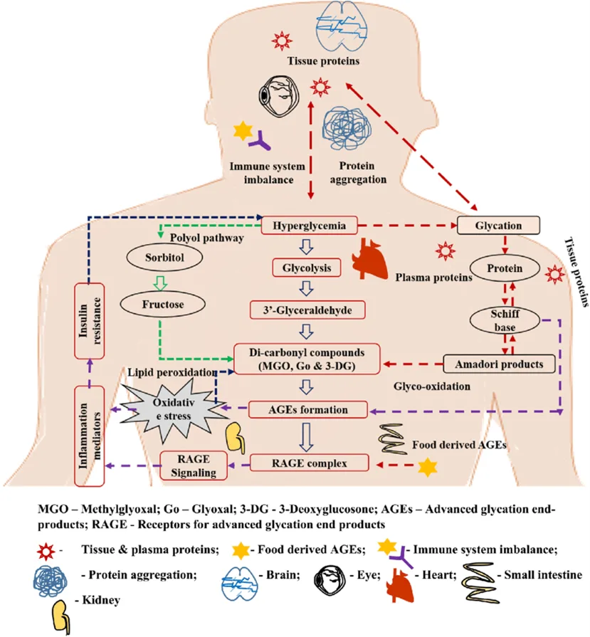 Peningkatan kadar glukosa darah mengaktifkan berbagai jalur metabolik non-fisiologis yang memicu stres oksidatif dan peradangan melalui aktivasi reseptor RAGE. Akumulasi AGEs berkontribusi terhadap kerusakan protein struktural, termasuk kolagen pada tulang, sendi, otot, dan tendon, sehingga berperan dalam patofisiologi gangguan muskuloskeletal dan nyeri kronik.