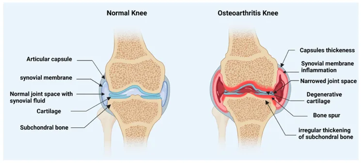 Gambar 1. (a) anatomi lutut normal dan OA (osteoarthritis). (b) nyeri pada degenerasi diskus intervertebralis